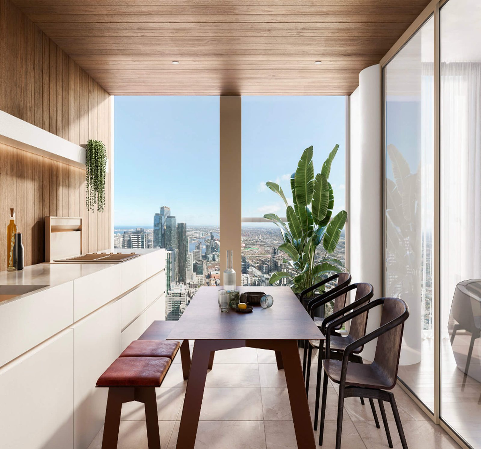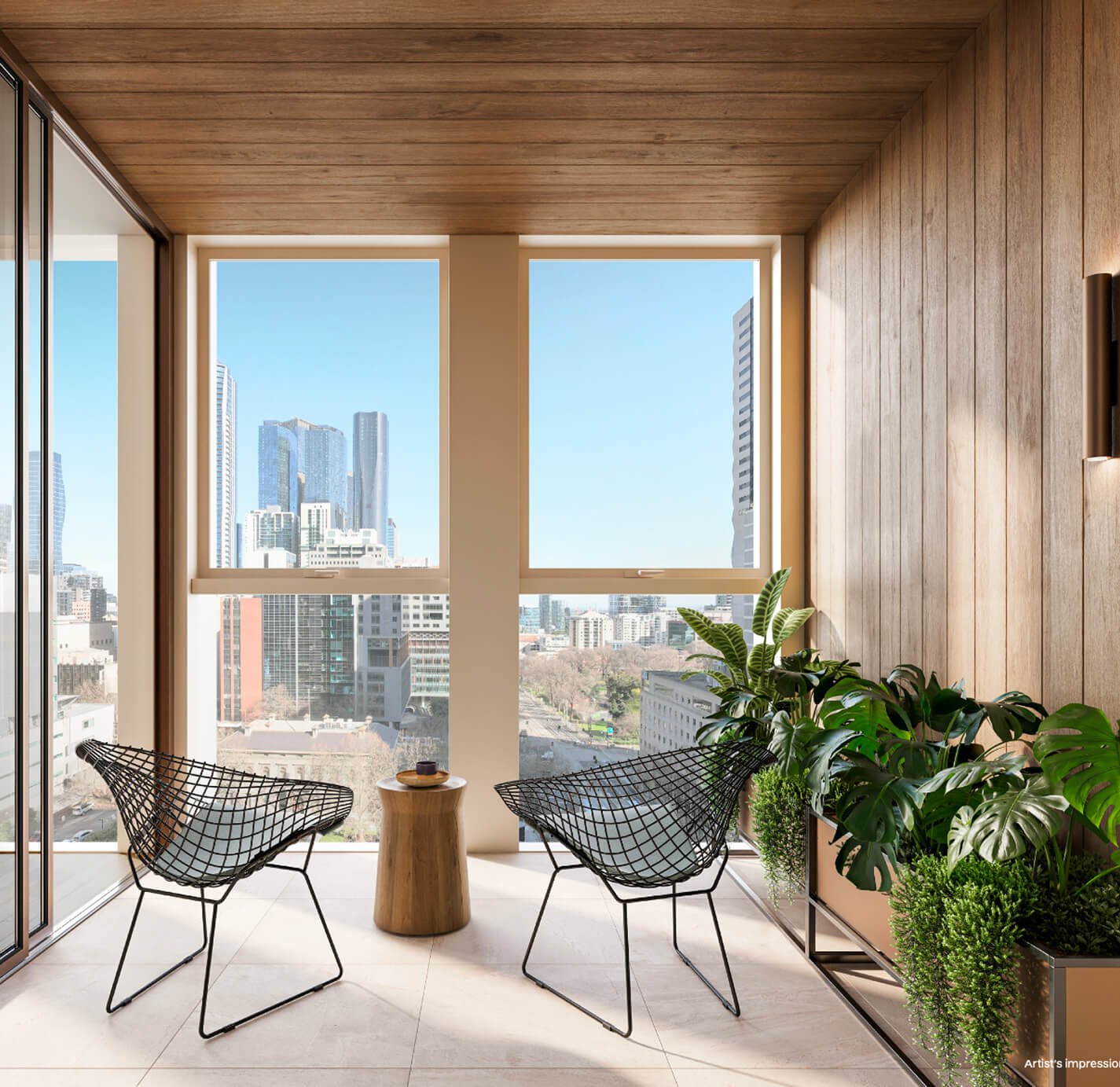 This innovative choice allows residents to transform the balcony into an intimate living or working space that opens up to panoramic views of Melbourne, the river, the bay, and the distant hills.
